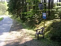 Klasický krakorcový jednotyčový zastávkový sloupek typu „mikulášská hůl“. Mezilesí, Karbanův mlýn.