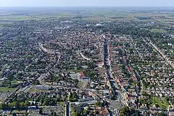Nejstarší budovou ve městě je tzv. Korvínův dům[2] (maďarsky Korvin-ház). Pochází z přelomu 15. a 16. století. Na hlavním náměstí stojí také barokní dům Zichy ház z 18. století. V centru se také nachází ještě Petöfiho dům a synagoga.