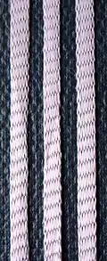 Snímek vlevo znázorňuje vzorek italského výrobku nabízeného jako pásková příze v německém maloobchodě v 80. letech 20. století.