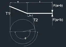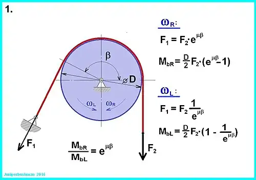 - , kde je Eulerovo číslo, je součinitel tření mezi pásem a kolem či bubnem a je úhel opásání (v obloukové míře).[1]
