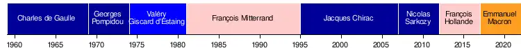 - 1. Charles de Gaulle: 8. ledna 1959 – 28. duben 1969 (první prezident zvolený přímou volbou podle ústavy z roku 1958).