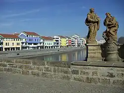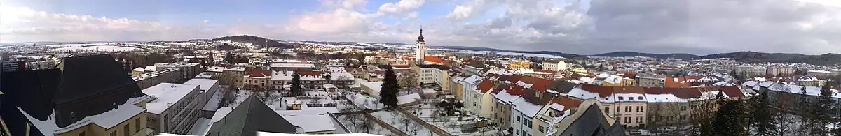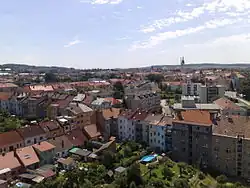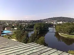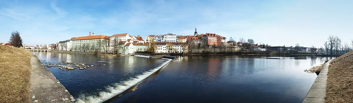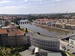![]() Pohled na věž kostela, hradby a Otavu | |