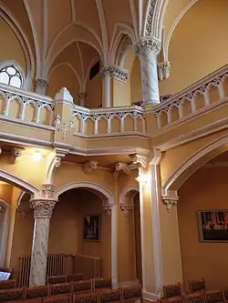 Reprezentativní vstupní haly mají žebrovou klenbu na sloupech s rostlinnými ornamenty na hlavicích. Nástropní štuková zrcadla mají na rámech rostlinné dekory. V jednom z rámů se dochovaly zbytky nástropní malby. V obou vestibulech jsou pamětní desky s reliéfním portrétem hraběte Pöttinga. Do poschodí vedou trojramenná schodiště s neogotickými detaily výzdoby a původním zábradlím.