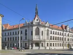 Fasáda hlavních budov se třemi řadami obdélných oken oddělených římsami je zdobena bosáží. Vstupy do budov na Palackého a Pöttingově ulici tvoří nevýrazné rizality s motivy slepých arkád s lomeným obloukem a dalšími prvky (fiály, krabi, rostliny). Nároží tvoří pětiosý rizalit s arkýřem kaple a hlavní věží. Vysoká okna kaple s lomeným obloukem jsou členěna kružbou.