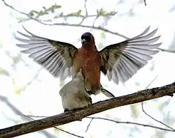 Samec je v období rozmnožování silně teritoriální a ze „svého území“ vyhání konkurenty. Při námluvách načechrává peří a pozornost samice se snaží upoutat vábením a vystavováním jasně zbarvené hrudi.[12]
