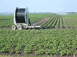 Závlaha postřikem je možná ve fázi růstové a ve fázi přípravy tvoření květních pupenů. Ve fázi kvetení nepřichází v úvahu a ve fázi plodnosti jen na počátku tvoření plodů, před dozráváním by podporovala hnití plodů.[4]