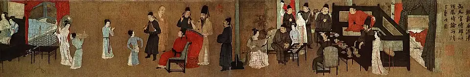 Část sungské kopie (z 12. století) Nočních zábav Chan Si-caje, Ku Chung-čung, 10. století. Vpravo baví skupinu hostů hráčka na loutnu pchi-pcha.