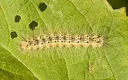 Larvy jsou drobné žlutavé, žlutozelené, dlouze ochlupené housenky, dorůstají délky 3,5 cm.[3][4]
