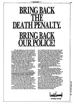 Budoucí prezident USA Donald Trump, tehdy (1989) coby realitní magnát nechal v řadě novin publikovat inzerci, ve které v souvislosti s případem volal po znovuzavedení trestu smrti. Inzerce ho stála 85 000 dolarů.