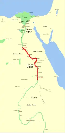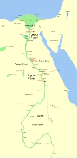 Mapa znázorňující rozšíření kultury Nakáda I. ve starověkém Egyptě.