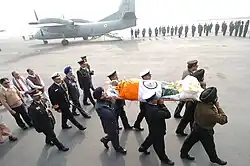 Tělo zesnulého premiéra P. V. Narasimhy Raoa, zahalené do vlajky Indické republiky, nesené příslušníky armády, námořnictva a letectva na letišti v Dillí na cestě do Hajdarábádu ke kremaci (24. prosinec 2004)
