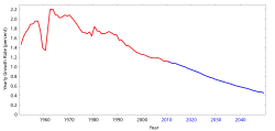 Celosvětový trend však směřuje k poklesu porodnosti – zatímco v roce 1990 byla úhrnná světová plodnost 3,24 dítěte na ženu, v roce 2009 to bylo již jen 2,47 dítěte na ženu, přičemž k prosté reprodukci je třeba 2,1 dítěte na ženu. Proto někteří předpokládají, že se do roku 2060 světová populace stabilizuje a začne klesat.[16] Nicméně podle mnoha odborníků je dlouhodobě udržitelná lidská populace kolem 3 miliard lidí [15], takže i pokud by došlo k pozvolnému poklesu populace, problém přelidnění bude ještě dlouhou dobu přetrvávat.