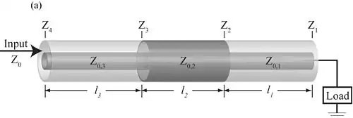 Stupňovité přenosové vedení se používá pro širokopásmové impedanční přizpůsobení. Lze je považovat za několik sériově zapojených segmentů přenosového vedení s charakteristickou impedancí každého jednotlivého prvku .[16] Vstupní impedanci lze získat opakovaným použitím řetězové relace