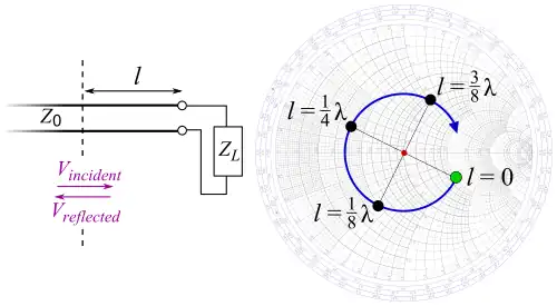 Protože charakteristická impedance každého segmentu přenosového vedení je často odlišná od impedance čtvrtého, vstupního kabelu (znázorněného pouze šipkou s označením na levé straně výše uvedeného schématu), kružnice transformace impedance je posunuta mimo střed podél osy Smithova diagramu, jehož impedanční reprezentace je obvykle normalizována vůči .