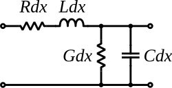 - Distribuovaný odpor vodiče je reprezentována sériovým rezistorem (s hodnotou v Ohmech na jednotku délky).
