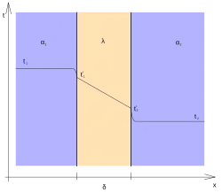 Za ustáleného stavu je možné pozorovat rozdělení teplot podobně jako na obrázku, kde je šířka stěny, je teplota látky před stěnou a je teplota látky za stěnou, přičemž . Na rozhraní kapaliny a pevné látky se vytváří tzv. mezní vrstva, ve které dochází k prudké změně teploty, tzv. tepelný skok.
