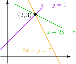 Každá rovnice odpovídá přímce, a přestože se každá dvojice přímek protíná, neboli každý pár rovnic má řešení, soustava všech tří rovnic řešení nemá.