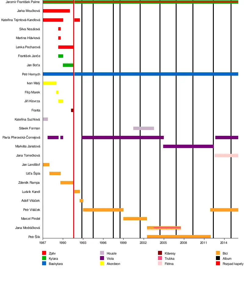 Do současnosti kapelou prošlo přes 30 lidí, ze zakládajících členů jsou nyní v kapele dva (Palme a Hernych). V prosinci 2011 opustil skupinu po devíti letech bubeník Petr Hugo Šlik, na jeho místo se vrátil Petr Vitáček, který již v kapele působil v letech 1993 až 1998. V roce 2012 odešla violistka Markéta Janatová a na její místo nastoupily flétnistka Jana Tomečková a violistka Pavla Čornejová, která již byla členkou kapely v letech 1987 až 1989 a 1993 až 2004.
