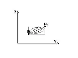 Na obrázku vpravo je idealizovaný p–V diagram. Významné stavy jsou označeny čísly 1 až 4. Trajektorie mezi dvěma stavy znázorňuje určitý termodynamický děj (označený písmeny A až D), při kterém se mění tlak nebo objem systému (nebo obojí). Význam diagramu je v tom, že znázorňuje množství energie vynaložené nebo přijaté systémem ve formě práce, protože čistá práce je reprezentována plochou uzavřenou čtyřmi úsečkami. Procesy 1-2-3 na obrázku produkují pracovní výstup, zatímco procesy 3-4-1 vyžadují dodání energie pro návrat do výchozího stavu; čistá práce je jejich rozdílem. Tento obrázek je značně idealizovaný, protože všechny přechody mezi stavy jsou znázorněny úsečkami a rohy jsou tvořeny pravými úhly. Pracovní cyklus skutečného zařízení má složitější tvar.[zdroj?]