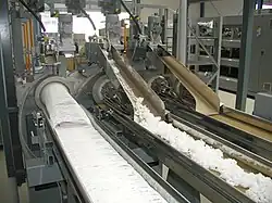Na dopravním pásu (šířka 30-50 cm) probíhá současně 50-60 nití rychlostí až 700 m/min., které se po paření automaticky navíjejí na cívky.