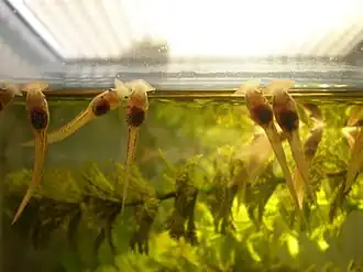 Přibližně za týden se z vajíček vylíhnou bílé, beznohé larvy pulců, které klesnou ke dnu a živí se ze žloutkového váčku. O týden později dostanou tmavší zabarvení a vyplavou k hladině. Tmavě hnědí pulci mají široké pysky tvořící nálevku, kterou z hladiny vysávají jemné částice potravy (což mohou být řasy, pyl, plankton, mikroorganizmy), zatímco tělo visí vertikálně dolů. V ústní dutině mají jemné kožní řasy, kterými nasávanou vodu filtrují a vybírají vhodné poživatiny. Ocas mají protáhlý se zaobleným hrotem.