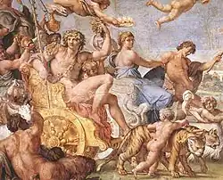 Hlavní obdélníkové pole uprostřed stropu zobrazuje Triumf Bakcha a Ariadny a jejich svatební průvod. V dalších polích jsou mimo jiné namalovány dvojice Venuše s Anchisem, Kyklop a Polyféna, Diana a Endymion, Aurora s Cephalem, Jupiter a jeho žena Juno, Herkules a jeho žena Iola. Nechybí ani homosexuální vztahy, například Ganymedes, který je unášený Jupiterem v podobě orla, Apollon a jeho milenec Hyacint.