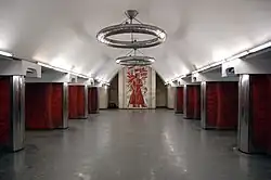 Stanice je trojlodní, úzké pilíře jsou obloženy červeným smaltem a ocelí. Na konci nástupiště se nachází umělecká kompozice, která vyobrazuje rudoarmějce. Na druhém konci se nachází eskalátory vedoucí do vestibulu s pokladnou a následně do ulice Velyká Vasylkivská.