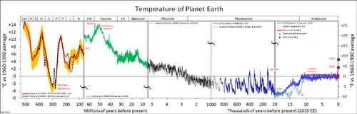 Během fanerozoika byla nejčastěji globálně průměrnou hodnotou povrchové teploty hodnota přibližně 24 °C (počátkem 21. století je tato hodnota cirka 17 °C) a na zemských pólech se měnila v rozsahu větším než 40 °C.[3]