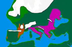 Evropská útočiště v době ledové před 20 000 lety. Z kultury Solutréen na jihozápadě Evropy se vyvinula kultura Magdalénien.