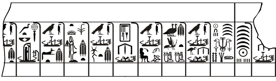 Ve spodním registru je v prvním okně (zleva) kartuše faraona Snofrua, prvního faraona 4. dynastie, v sousedním okně je zápis: