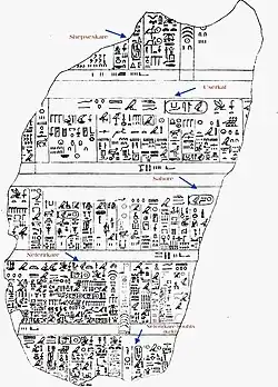 - ↑ KREJČÍ, Jaromír; Mohamed Osman; Massimiliano Nuzzo. New research and insights into the Palermo Stone [online]. Praha: Czech Inst. of Egyptolgy, 2018. Dostupné v archivu pořízeném dne 2018-10-12. (anglicky)