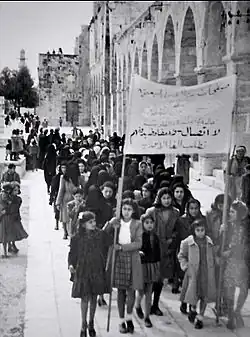 Historie Palestinské národní identity je otázkou diskutovanou mezi učenci.[70] Právní historik Assaf Likhovski zastává názor, že palestinská identita se začala projevovat v prvních dekádách 20. století.[70] První požadavek na národní nezávislost Levanty byl deklarován Syrsko-palestinským kongresem 21. září 1921.[74] Po vzniku státu Izrael a palestinských exodech v letech 1948 a 1967 začal termín Palestinec označovat nejen místo narození, ale také sdílenou minulost a budoucnost ve smyslu zamýšleného Státu Palestina.[75]
