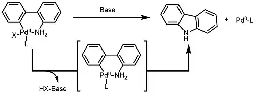 Palladacyklické sloučeniny se používají jako prekatalyzátory, nejčastěji v redukčních eliminacích, kde se mění palladnaté (Pt2+) komplexy na aktivní Pd0. U 2-aminobifenylových palladacycklů se vytváří kineticky aktivní 12elektronový komplex Pd0, což umožňuje další oxidačně adiční reakce.[8]