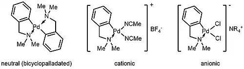 Palladacyklické komplexy mohou být neutrální, kationtové, nebo aniontové. Neutrální mohou být, v závislosti na vlastnostech ligandů, monomerní, dimerní, či bis-cyklopalladované.