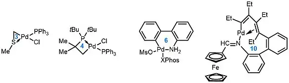 S palladacyklickými prekatalyzátory lze dosáhnout vysokých reaktivit a selektivit u Heckových a mnoha křížově párovacích reakcí, jako jsou Suzukiova,[9] Sonogaširova,[10] Stilleova[11] a Buchwaldova–Hartwigova.[12]
