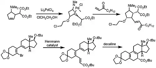 Palladacykly byly využity i při několika totálních syntézách.[13][14]
