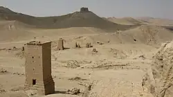 Rozsáhlé pohřebiště u městských hradeb, hroby mají podobu věží nebo domů. Nejstarší jsou pohřební věže z pískovce o třech nebo čtyřech patrech a s podzemními komorami. Většinou byly určeny jen pro nejbohatší rodiny, např.: věž Elahbel. Byly vyzdobeny štuky a basreliéfy. Reliéfy představují duši nebo osobnost pohřbené osoby. Věrně vyobrazují podobu zesnulých. Objeveno mnoho soch, které zachycují strnulé postavy, většinou zepředu. Hrobky bohatších rodin také obsahují různé předměty, např.: vázy, šperky, mince. Dnes vystaveny v místním muzeu nebo sbírkách antického umění v Louvru a Damašku.