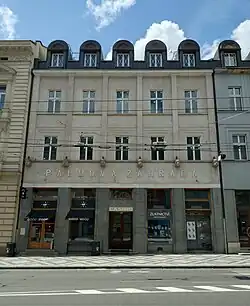 V architektonickém návrhu Jan Kotěra zcela upustil od motivů florální secese, uplatněných na fasádě Okresního domu, a rozhodl se pouze pro střídání horizontálních a vertikálních linií.[7] Ve vysokých lizénových rámcích se uplatňuje ústupkové rámování, podobně jako například na Kotěrově návrhu Mozartea.[1] Přízemí obsahuje velké výkladce, nejvyšší patro pak oblé arkýře s okny.[7] Parter je zakončen římsou s maskarony navrženými Janem Štursou.[1]