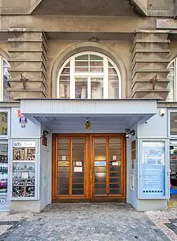 Busta a pamětní deska na domě v Kaprově ulici 10 v Praze 1, kde se nachází Ježkův Modrý pokoj.