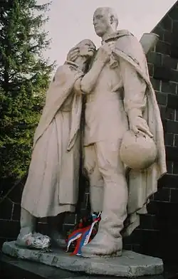 V památníku byla původně v roce 1949 instalována socha československého vojáka vzdávajícího hold padlým československým vojákům zde pohřbeným. Autorem sochy byl akademický sochař Adolf Vítek. V roce 1954 byla socha z ideologických důvodů odstraněna a zničena. V roce 1964 byl památník doplněn o bronzové sousoší Žalujem národního umělce Jána Kulicha: matka děkuje sovětskému vojákovi za osvobození a zároveň žaluje fašismus za příkoří a utrpení, které způsobil. Socha měla zejména vyjadřovat československo-sovětskou družbu.[1] V roce 2014 bylo sousoší Žalujem přemístěno do interiéru vyhlídkové věže a do památníku byla navrácena kopie původní sochy Adolfa Vítka.