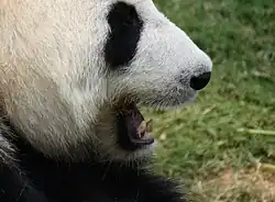 Dospělá panda velká má celkem 40–42 zubů a zubní vzorec zdravého dospělého jedince vypadá následovně: I 3/3, C 1/1, P 4/4, M 2/3 = 42. Na rozdíl od jiných medvědů jí chybí jedna z běžných spodních stoliček, která je nahrazena velkou a plochou stoličkou přizpůsobenou k drcení bambusových vláken. Čelistní svaly se upínají v horní části lebky na sagitální hřeben, díky čemuž má neuvěřitelnou sílu skusu (viz odstavec níže). Masem, resp. drobnými živočichy se živí pouze výjimečně, přesto má i ona vyvinuté zřetelné, ale relativně krátké, kuželovité a tedy zaoblené špičáky, díky nimž může potenciální kořist uchopit do tlamy.[2][44][55][56][57][58] Při žvýkání a pohybu čelistí do stran, jak je u býložravců typické, si svými špičáky nepřekáží díky upravenému temporomandibulárnímu kloubu a premolárním zubům.[59]