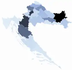![]() Mapa chorvatských žup podle počtu aktuálně nakažených nemocí covid-19 na sto tisíc obyvatel | |