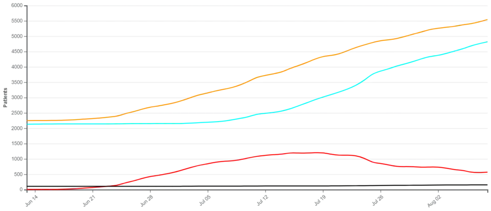 Nejvyšší počet aktuálně nemocných (1 207) byl zaznamenán 19. července, ten byl ovšem nižší než počet nakažených dne 14. dubna během první vlny, kdy dosahoval 1 258. Nejvíce nových případů (140) bylo zaznamenáno 11. července, nejvíce uzdravení (223) dne 25. července, nejvíce úmrtí (5) rovněž dne 25. července.