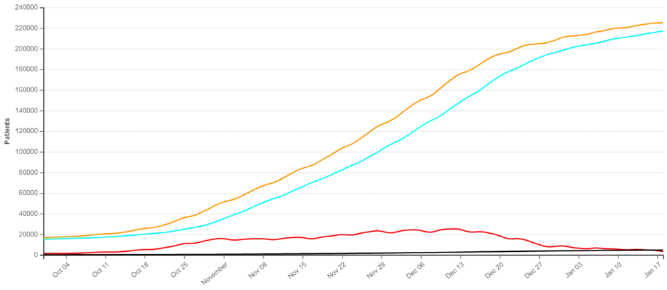 - 18. ledna 2021 bylo zaznamenáno již více než 225 000 nakažených