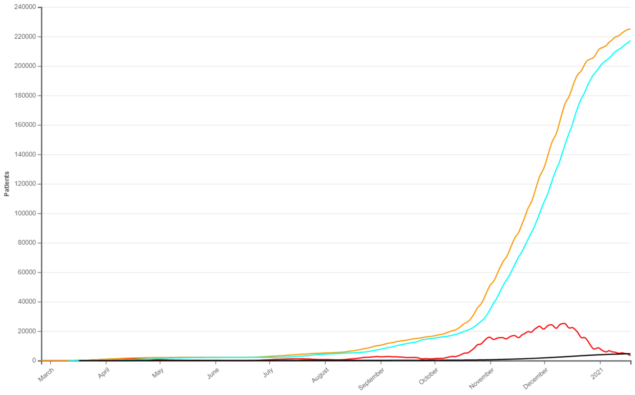 Oranžová křivka ukazuje celkový počet nakažených, modrá počet uzdravených, červená počet aktuálně nakažených a černá počet zemřelých.