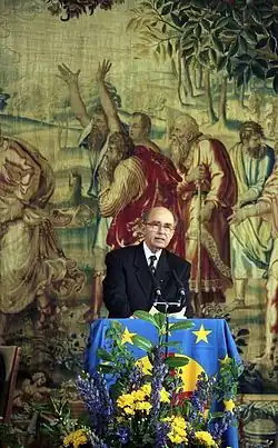 Otto von Habsburg jako řečník u příležitosti propůjčení vyznamenání Panevropské unie německému kancléři Helmutu Kohlovi v roce 1991