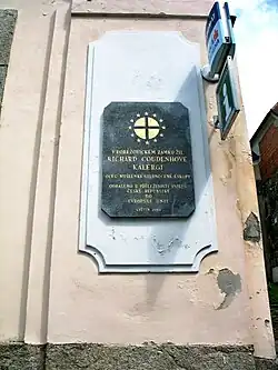 Pamětní deska, připomínající hraběte Richarda Coudenhove-Kalergiho a jeho myšlenku Panevropské unie, instalovaná u příležitosti vstupu ČR do Evropské unie v poběžovickém zámku