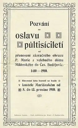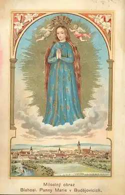 - ↑ ČERNÝ Jiří: Milostný obraz Panny Marie Budějovické a jeho multiplikace, in Zprávy památkové péče, 2003, č. 5, s. 328.