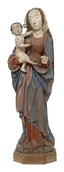 Štíhlá postava panny Marie stojí v esovitém prohnutí na pravé noze. Na pravém boku drží nahého Ježíška, který ji levou rukou objímá kolem krku a přidržuje její roušku. Špička levé odlehčené nohy je vysunuta pod záhybem pláště na podstavci. Obrys figury rozšiřuje v úrovni boků podkasaný plášť, jehož cíp Marie přidržuje pravou rukou před tělem. Nezvyklými motivy je podebrání přehybu pláště mezi palcem a ostatními prsty pravé ruky, uzavření pláště před tělem a jeho podkasání kolem rukávů v hlubokém mísovitém záhybu. Způsob podvinutí roušky pod vlasy za krkem ukazuje na inspiraci švábským uměním.[1] Řezbář mohl pracovat podle kresby či grafiky švábského původu, kde se tyto motivy objevují v tvorbě následovníků Hanse Multschera.[2]