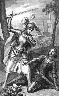 Krátce nato se Francouzům pod vedením Jany podaří vniknout do nepřátelského vojenského tábora. Zde se setkává s velšským rytířem Montgomerym. Ten odhodí zbraně a prosí o milost. Jana však neprojevuje žádné slitování a v následném souboji jej zabije. Objeví se burgundský vévoda a chce s Janou bojovat. Jana však pronese tak silnou vlasteneckou řeč, že vévoda vycítí její božskou moc a rozhodne se přidat se na její stranu. Z vděčnosti za vítězství povýší Karel Janu do šlechtického stavu.
